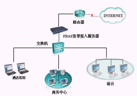 該系統(tǒng)的實施非常簡單,所有的功能都在FBAS寬帶接入服務器中實現(xiàn),該設備只要插入在酒店局域網的中心交換機和出口路由器之間,就可以實時采集用戶上網的時間、流量等計費信息并發(fā)送給后臺計費系統(tǒng)。這樣的實施方案不需對酒店的網絡環(huán)境進行任何改動,而且酒店的管理人員經過簡單的培訓,就可以很容易的維護計費系統(tǒng),對酒店的網絡資源進行計費管理了。