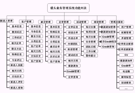 運行于瀏覽器、跨地域信息公享;人力資源信息專業(yè)、覆蓋全面;系統(tǒng)功能強(qiáng)大、操作簡單方便;靈活配置,可擴(kuò)展性強(qiáng);復(fù)雜的業(yè)務(wù)關(guān)聯(lián)性及專業(yè)的業(yè)務(wù)報表。全部采用模塊化設(shè)置,包含了候選人管理、客戶管理、雇員管理、定單管理、活動管理、績效管理、統(tǒng)計報表和系統(tǒng)維護(hù)管理等模塊,以及幾十項具體業(yè)務(wù)功能細(xì)節(jié)。系統(tǒng)功能模塊明細(xì)表如下: