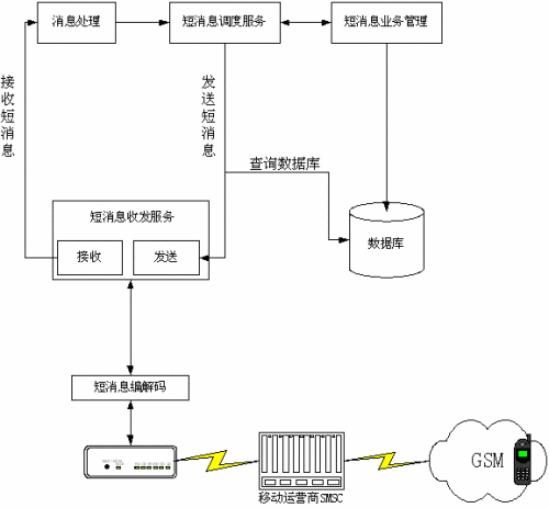 在應(yīng)用程序和短消息發(fā)送設(shè)備之間提供橋梁作用,應(yīng)用程序的所有命令都需通過該模塊編碼傳遞給短消息設(shè)備執(zhí)行,包括打開設(shè)備、初始化端口、發(fā)送短消息、關(guān)閉設(shè)備等命令。短消息模塊接收到的數(shù)據(jù)也通過本模塊解碼,讀出其中內(nèi)容,上傳到應(yīng)用程序。