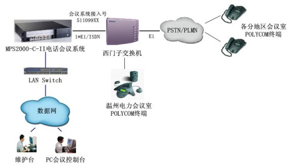 MPS2000-C電話會(huì)議系統(tǒng)通過數(shù)字中繼(采用ISDN信令)與溫州電力原有的西門子交換機(jī)互聯(lián),作為會(huì)議應(yīng)用服務(wù)器,為溫州電力原有電話網(wǎng)絡(luò)內(nèi)的用戶提供電話會(huì)議功能。