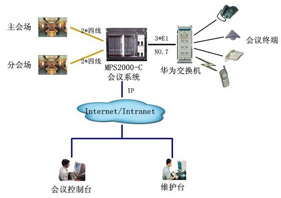 該會議系統(tǒng)通過3個(gè)數(shù)字中繼,與華為用戶交換機(jī)互連,通信采用NO.7信令。4路4線中2路接主會場調(diào)音臺,2路分會場調(diào)音臺,實(shí)現(xiàn)會議室擴(kuò)音設(shè)備的接入。通過以太網(wǎng)口與D-LINK網(wǎng)絡(luò)交換機(jī)互連,接入廊坊電力的局域網(wǎng),實(shí)現(xiàn)維護(hù)管理及會議控制等功能。