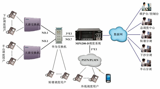 杭州繞城高速公路分成東西南北四段,此次,需要調(diào)度轉(zhuǎn)塘、下沙、半山等分處。目前,MPS2000-D指揮調(diào)度系統(tǒng)通過3個(gè)E1與華為交換機(jī)相連,基于原有通信網(wǎng)絡(luò),實(shí)現(xiàn)轉(zhuǎn)塘、下沙、半山調(diào)度用戶的接入。同時(shí),指揮調(diào)度系統(tǒng)通過1個(gè)E1出局,實(shí)現(xiàn)外線調(diào)度用戶的接入,本次項(xiàng)目調(diào)度用戶共設(shè)置了120門。