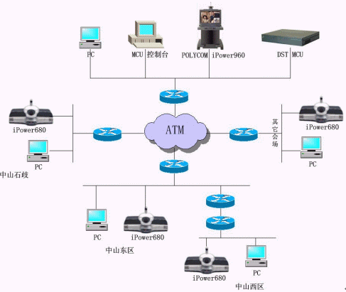 中山公安項(xiàng)目使用一臺(tái)DST H.323 MCS 3048/DFG的MCU、25套IPOWER600 SBRI終端和一套IPOWER900終端,目前終端使用4.01.408版本,通過的是IP OVER ATM網(wǎng)絡(luò),到每個(gè)會(huì)場的帶寬足夠---至少10M,會(huì)議召開速率為768Kbps。市局會(huì)議中心采用IPOWER900,其它25個(gè)分局會(huì)場都使用IPOWER600。