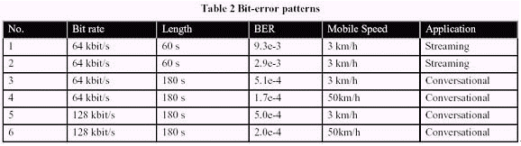 在H.264/AVC的標(biāo)準(zhǔn)化進(jìn)程中,移動(dòng)視頻傳輸?shù)闹匾砸呀?jīng)在3G移動(dòng)傳輸里面通過(guò)對(duì)基于H.324M的電路交換會(huì)話服務(wù)、包交換會(huì)話和流服務(wù)得到了證實(shí)。這些測(cè)試情況允許適當(dāng)?shù)木幋a特征、測(cè)試和容錯(cuò)仿真等特征的選擇,同時(shí)也可以得到有意義的測(cè)試結(jié)果。在本文,我們將會(huì)把重心集中在基于IP的測(cè)試情況。在正常的測(cè)試情況下,我們會(huì)定義6個(gè)測(cè)試情形組合,主要測(cè)試通過(guò)3G移動(dòng)網(wǎng)絡(luò)的包交換會(huì)話服務(wù)和包交換流媒體服務(wù)。另外,測(cè)試環(huán)境包括簡(jiǎn)單的脫機(jī)3GPP/3GPP2仿真軟件、程序接口和評(píng)估標(biāo)準(zhǔn)。無(wú)線信道使用專門(mén)生產(chǎn)用于移動(dòng)無(wú)線信道仿真的位率差錯(cuò)模板來(lái)進(jìn)行仿真。 位率差錯(cuò)模板在物理層上和RLC/RLP層下來(lái)捕獲,因此,它們?cè)趯?shí)驗(yàn)被用于物理層仿真。通過(guò)位率差錯(cuò)模板實(shí)驗(yàn)中得出的碼率、長(zhǎng)度、位錯(cuò)誤率和移動(dòng)速度數(shù)據(jù)詳見(jiàn)下表2。