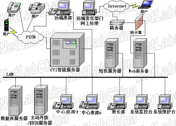 客服中心系統(tǒng)硬件設(shè)備由以下核心部件組成:通信智能服務(wù)器、數(shù)據(jù)庫服務(wù)器、微機(jī)、電話機(jī)。