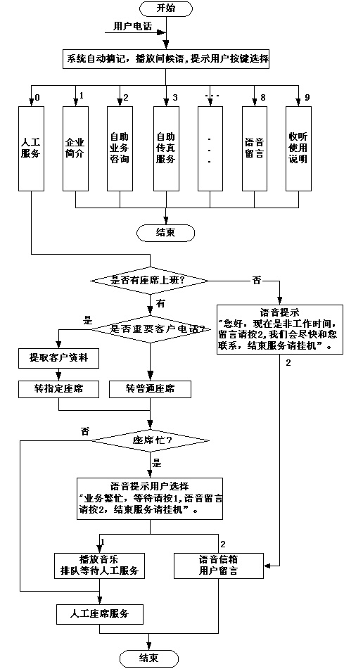 ·用戶撥入系統(tǒng)后,用戶根據(jù)語音提示按鍵選擇業(yè)務(wù)功能。由IVR交互式語音應(yīng)答完成自助 式業(yè)務(wù)查詢、業(yè)務(wù)查詢等聲訊服務(wù)。如需人工服務(wù),按0隨時(shí)轉(zhuǎn)人工接通座席,以減輕人工服務(wù)壓力。