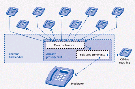 Prosody在同一時間內可實現248方會議。RNIB的解決方案能夠同時進行3個會議,每個會議可達10個參與者。之所以限定在10個參與者之內,主要是便于盲人或視弱的管理人員管理。此外,也確保了會議管理員能夠從RNIB的WAN 電話網絡或辦公室及家居電話網絡接入。與會者中的一員可以根據需要與管理員進行一對一談話。