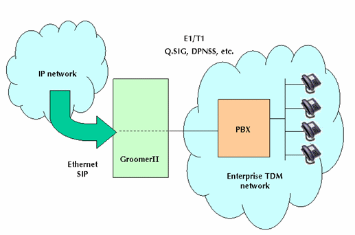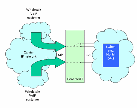 圖1中的GroomerII支持PRI協(xié)議,如:NI-2、ETS300和INS1500等,可以實(shí)現(xiàn)網(wǎng)關(guān)的功能把運(yùn)營商自己的電路交換網(wǎng)和IP網(wǎng)絡(luò)相互連接在一起。這種設(shè)置允許網(wǎng)絡(luò)運(yùn)營商向其他業(yè)務(wù)供應(yīng)商提供批量VoIP業(yè)務(wù)。這類業(yè)務(wù)運(yùn)營商據(jù)此可以向他們的客戶提供具有區(qū)分性的業(yè)務(wù),如:利用SIP電話呼叫等。