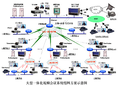 上圖為 Polycom 公司大型一體化視頻會議系統(tǒng)解決方案示意圖。Polycom公司是業(yè)界唯一可以提供端到端解決方案的公司。Polycom公司的視頻會議系統(tǒng)以其出色的性能,穩(wěn)定可靠的表現可以為大型企業(yè)、電信運營商提供一個完整的一體化解決方案。