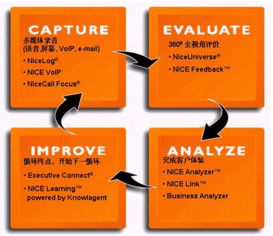 NICE System公司率先提出了CEM-客戶體驗管理-的新觀念,是客戶體驗管理的先驅(qū)者,它將此觀念融入在NICE錄音網(wǎng)控系統(tǒng)中,與ACD、CTI及CRM等客服中心既有的投資設備整合為一體,便可達到隨時掌握客戶與客服中心間的互動經(jīng)驗,以期能夠隨時調(diào)整客服中心的經(jīng)營方向與策略,提升客戶的滿意度,并改善坐席人員的服務效率與品質(zhì)等。 在NICE CEM的概念中,主要是以四個作業(yè)循環(huán)達成改善的目標,包括記錄(Capture)、評估(Evaluate)、分析(Analyze)、改善(Improve)等。