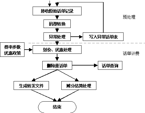 區(qū)域計(jì)費(fèi)中心從交換機(jī)實(shí)時/定時采集原始話單數(shù)據(jù),它是整個系統(tǒng)的起始點(diǎn),也是系統(tǒng)其它部分的基礎(chǔ)。其性能直接影響整個系統(tǒng)的運(yùn)行效果。對該模塊要求穩(wěn)定可靠、處理靈活。 “八國九制”意味著,一個好的計(jì)費(fèi)采集系統(tǒng),必然要求它能夠處理多種交換機(jī)格式。比如EWSD、S1240、5ESS等等。 在采集所用網(wǎng)絡(luò)傳輸協(xié)議上,一般要求系統(tǒng)支持X.25/FTAM、X.25/CMIP等協(xié)議。 2.計(jì)費(fèi)結(jié)算 采集機(jī)從交換機(jī)上采集下來原始話單文件,該類文件是BCD碼文件,需要進(jìn)行碼型轉(zhuǎn)換,變成ASCII碼文件,為后續(xù)的計(jì)費(fèi)處理創(chuàng)造條件。 話單格式轉(zhuǎn)換:話單格式轉(zhuǎn)換從交換機(jī)下載的二進(jìn)制信息中提取用于計(jì)費(fèi)和統(tǒng)計(jì)的信息,并從二進(jìn)制格式轉(zhuǎn)換為文本格式。但是由于上面提到的原因,國內(nèi)交換機(jī)種類比較多,各種交換機(jī)的數(shù)據(jù)格式都不相同,即使是相同的交換機(jī),由于需要版本升級,也會對數(shù)據(jù)格式產(chǎn)生影響。假如預(yù)處理模塊不能靈活地處理各種格式的文件,則勢必會對電信服務(wù)商的投資造成浪費(fèi)。國創(chuàng)公司在話單預(yù)處理中,提供了一種“自定義話單格式”方式,用戶可以根據(jù)自己交換機(jī)的數(shù)據(jù)格式進(jìn)行配置,而預(yù)處理模塊不需進(jìn)行修改。即可以適應(yīng)當(dāng)前多種交換機(jī)并存的局面,又可以適應(yīng)未來交換機(jī)版本升級的需求,極大地保護(hù)了用戶的投資。 計(jì)費(fèi)劃價處理: 計(jì)費(fèi)計(jì)算模塊根據(jù)話單中記錄的起始時間、通話時長、對端號碼等信息在資費(fèi)策略庫中查找滿足條件的費(fèi)率極其優(yōu)惠策略。從而計(jì)算出此次通話應(yīng)向用戶收取的基本費(fèi)用。特別地,考慮到業(yè)務(wù)的發(fā)展與變化,系統(tǒng)可對費(fèi)用中的各項(xiàng)子費(fèi)用單獨(dú)計(jì)算,并能夠適應(yīng)新的優(yōu)惠策略的增加。整個計(jì)費(fèi)流程如下:
