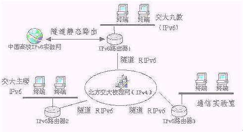 FH6501(IPv6路由器)已經(jīng)在北方交通大學學生IPv6實驗床實際安全運行了六個月。北方交通大學學生IPv6實驗床采用我公司IPv6路由器產(chǎn)品,架構了三個主節(jié)點,借助隧道連接到由Nokia資助建設的中國高校IPv6實驗床。目前三個主節(jié)點之間的連接是借助于學校原有的IPv4網(wǎng)絡,通過隧道技術實現(xiàn)節(jié)點間的通信(見圖示)。