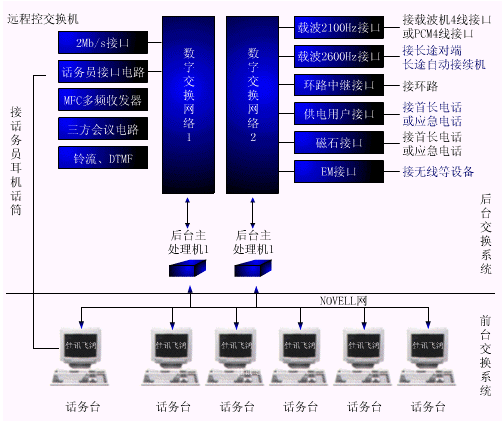 "前臺座席系統(tǒng)"包括班長臺和話務臺,均采用微機,運用先進的計算機聯(lián)網(wǎng)技術(shù),將它們通過網(wǎng)絡與"后臺交換系統(tǒng)"相連。班長臺和所有話務臺的硬件連接完全相同,任何一臺損壞,不影響其它話務臺的使用,即不存在關鍵接點,提高了系統(tǒng)的安全可靠性。全漢化圖形界面,交互式人機操作方式,簡單明了,易于掌握。所有話務臺均為集記錄、查號、市話轉(zhuǎn)接、長話轉(zhuǎn)接為一體的綜合型人工話務臺,所有功能由數(shù)據(jù)定義,可分可合,可方便的進行設置,也可臨時并席,為系統(tǒng)高質(zhì)量的服務提供了可靠的基礎。所有話票均在計算機上填寫,由網(wǎng)絡自動傳送,不再使用紙話票,也不需人工分發(fā)話票,極大的減輕了勞動強度,提高了辦事效率。為了減小系統(tǒng)規(guī)模,我們將查詢、計費、統(tǒng)計、管理、維護五種功能融合為一體,統(tǒng)一成為多功能的班長臺,其功能亦可分可合,視用戶需求而定。