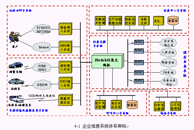 本項(xiàng)目中的企業(yè)信息系統(tǒng)由中心系統(tǒng)、場站系統(tǒng)、車載設(shè)備及數(shù)據(jù)采集系統(tǒng)和遠(yuǎn)程訪問系統(tǒng)組成,其中中心系統(tǒng)包括信息中心、呼叫中心、信息交換系統(tǒng)。項(xiàng)目實(shí)施過程中采用了黎明網(wǎng)絡(luò)自主知識產(chǎn)權(quán)的iSwitch信息交換機(jī),系統(tǒng)邏輯結(jié)構(gòu)如下圖所示: