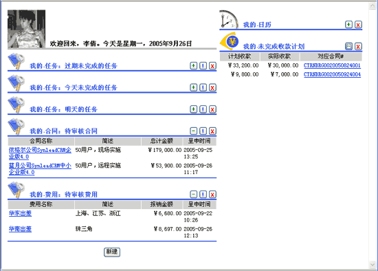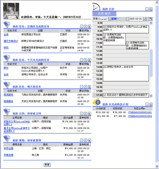 右側(cè)區(qū)域?yàn)橄到y(tǒng)限定的加載分組,例如“我的-日歷”、“我的-未完成收款計(jì)劃”。對(duì)于“我的-日歷”,您可以所見即所得地管理日程安排,十分方便地對(duì)日程事件拖拖拽拽。