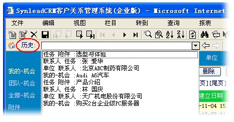 有必要回顧SynleadCRM先前解決數(shù)據(jù)森林穿行問題的重要方法——“歷史”記憶功能,它今后將與新增的“線程”向導共同幫助用戶游刃有余地操作CRM。