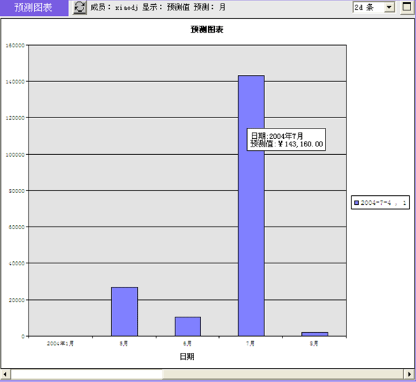 而銷售預(yù)測(cè),則是基于機(jī)會(huì)的這4項(xiàng)數(shù)據(jù)進(jìn)行運(yùn)算的:銷售額、結(jié)案日期、可能性和(是否加入)預(yù)測(cè)。例如如果圖3的機(jī)會(huì)被納入本次預(yù)測(cè),則預(yù)測(cè)模型將會(huì)在2004年6月18日這個(gè)時(shí)間點(diǎn),增加504,402.50 * 100% = 504,402.50元的一個(gè)預(yù)測(cè)值,在相同時(shí)間段的機(jī)會(huì)預(yù)測(cè)值將被累計(jì)求和。很顯然,可以在不同時(shí)間點(diǎn)(例如6月1日、7月1日、8月1日、9月1日)多次對(duì)2004年9月的銷售額進(jìn)行預(yù)測(cè)。得到一系列的銷售預(yù)測(cè)值變動(dòng)趨勢(shì)。