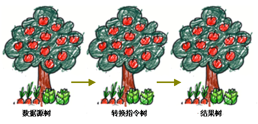 一棵或多棵數(shù)據(jù)源樹(XML數(shù)據(jù)源文件),通過一棵轉(zhuǎn)換指令樹(選擇數(shù)據(jù)、表達(dá)數(shù)據(jù)表現(xiàn)形式的模板文件),獲得了一棵結(jié)果樹(圖表、報表)。