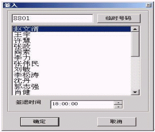 當(dāng)公司外出員工回到單位以后,在公司前臺(tái)的訂席系統(tǒng)操作臺(tái)上按"簽入"鍵;屏幕上將顯示工位的分布及占用情況;按相應(yīng)的工位后,屏幕將顯示輸入信息的菜單,輸入相應(yīng)的信息后,按"確定"按鈕,如下圖: