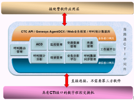 因此,商路通CTI 中間件既不是Link中間件(類似于CTConnect、TAPI、TSAPI,包含Link層和API層),也不是基于CTConnect、TAPI、TSAPI之上的呼叫中心中間件,而是集成以上兩者優(yōu)勢的CTI中間件。