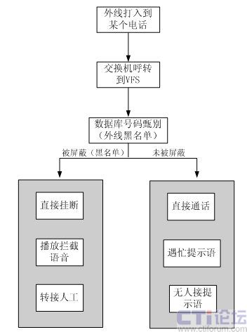 - 系統(tǒng)利用交換機(jī)的話音轉(zhuǎn)移功能,將轉(zhuǎn)移過來的來話信息進(jìn)行過濾處理,從而實(shí)現(xiàn)語音攔截的功能。