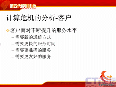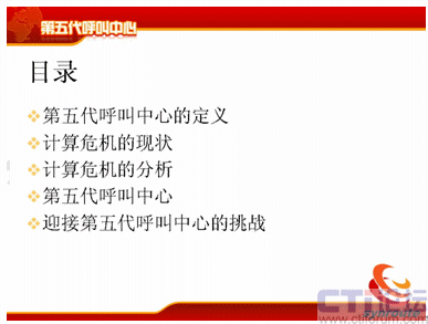 我把第五代呼叫中心的概念詳細(xì)地論述一下。主要是分成五個(gè)部分,第一個(gè)是第五代呼叫中心的定義;第二個(gè)計(jì)算危機(jī)的現(xiàn)狀;第三是計(jì)算危機(jī)的分析;第四第五代呼叫中心;第五是結(jié)論——迎接第五代呼叫中心的挑戰(zhàn)。