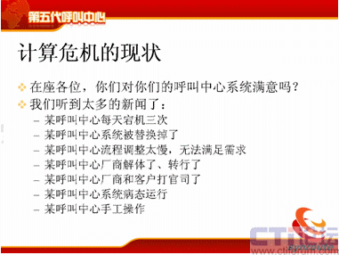 呼叫中心現(xiàn)在已經(jīng)了比較嚴(yán)重的計(jì)算危機(jī),我聽到了很多,因?yàn)槲抑攸c(diǎn)是在搞技術(shù)這一行當(dāng),我就問一個(gè)問題,在座的各位,你們對你們的呼叫系統(tǒng)滿意嗎?我相信大部分人可能嘴上都說比較滿意,但是很多人對深層次的矛盾都非常清楚,為什么不滿意?