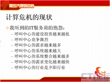 我們聽到IT服務(wù)商的抱怨可就更多了,說呼叫中心建設(shè)投資越來越低了,我在十年前建設(shè)一個(gè)20個(gè)座席的呼叫中心,能掙1500萬;可是現(xiàn)在20個(gè)座席的呼叫中心,10萬塊錢就把我打發(fā)了。呼叫中心競爭越來越激烈,投一個(gè)標(biāo),雖然一個(gè)呼叫中心只有100萬,這時(shí)候來的廠家有50家,相互壓價(jià),相互壓價(jià),這時(shí)候利潤都沒有了,F(xiàn)在的需求是越來越多了,體現(xiàn)在各個(gè)環(huán)節(jié),運(yùn)營管理和業(yè)務(wù)模式上需求越來越多,最終客戶的要求也是越來越多,系統(tǒng)越來越大了,服務(wù)器也一大堆,以前一兩個(gè)服務(wù)器就夠了,現(xiàn)在需要4、5個(gè),7、8個(gè),這些服務(wù)器還需要相互進(jìn)行聯(lián)絡(luò)整合,系統(tǒng)的整合越來越多,比如要和ERP整合,要和CRM整合,要和供應(yīng)鏈整合,系統(tǒng)的整合越來越多,而且需求變化越來越大,呼叫中心需求的變化產(chǎn)生于很多方面,后面我會(huì)仔細(xì)介紹。呼叫中心的行業(yè)變成一個(gè)夕陽行業(yè)了,這是現(xiàn)在做IT服務(wù)商普遍在提的想法。