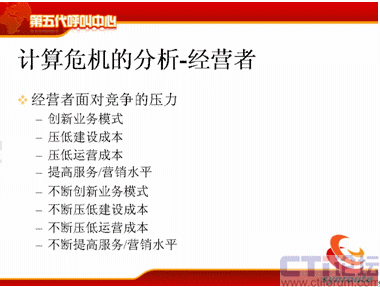 那么經(jīng)營者的壓力就更大了,首先我要?jiǎng)?chuàng)新業(yè)務(wù)模式,我以前是做客戶服務(wù)的,現(xiàn)在我要掙錢,我要增加收入,我要做電話營銷,壓低建設(shè)成本,壓低運(yùn)營成本,這個(gè)是大家很容易理解的。同時(shí)他是不斷地創(chuàng)新業(yè)務(wù)模式,不斷地壓低建設(shè)成本,不斷地壓低運(yùn)營成本,不斷地提高服務(wù)水平,這個(gè)不斷就給IT服務(wù)者傳遞了更大壓力。