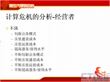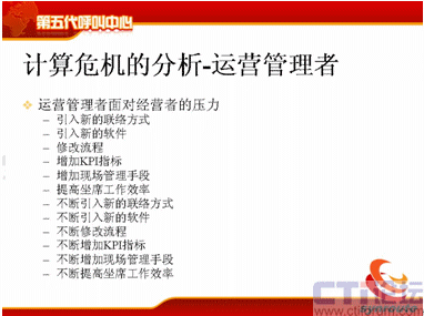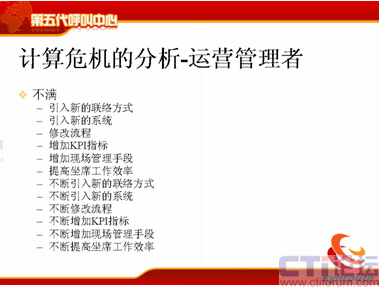 計(jì)算危機(jī)的下一方面是運(yùn)營管理者,可能在座很多人是做運(yùn)營管理的,你們會(huì)不斷去跟IT服務(wù)者提需求,我下一個(gè)月想引進(jìn)新的聯(lián)絡(luò)方式,下個(gè)月我想引進(jìn)新的軟件,引進(jìn)新的流程,我想增加KPI指標(biāo),我想增加現(xiàn)場的管理手段,我想提高座席的工作效率,后面也是不斷的,不斷地去引入新的聯(lián)絡(luò)方式。