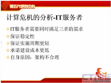 我分析一下計(jì)算的危機(jī),計(jì)算危機(jī)來源于三個(gè)方面,第一是客戶面對不斷提升的服務(wù)水平,現(xiàn)在需要新的通信方式,包括電話、傳真、短信、電子郵件等等,還包括網(wǎng)上的護(hù)航瀏覽,表單共享,電子排版等等通信方式。第二方面需要更快的服務(wù)時(shí)間,80%的電話是20秒接起,可是短信的響應(yīng)時(shí)間為什么這么長,需要更準(zhǔn)確的服務(wù),電話的服務(wù)是什么樣的,我現(xiàn)在需要網(wǎng)上交談的服務(wù)質(zhì)量也能夠得到保障等等,這是客戶對IT服務(wù)者提供的壓力。