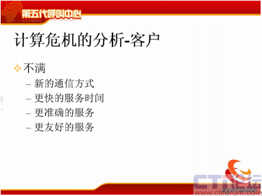 現(xiàn)在我們就分析一下后果,這時(shí)候計(jì)算危機(jī)的分析對于客戶來說,新的通訊方式我們都需要,可是呼叫中心沒有公布,我無法使用,更快的服務(wù)時(shí)間,大家看到了,比如說Web Chat,目前我點(diǎn)擊了80%是直接進(jìn)入留言的頁面,也就是說這時(shí)候沒有人工來服務(wù)了,或者是等待時(shí)間非常非常長,一個(gè)小時(shí)以后告訴我,排隊(duì)已經(jīng)到了,已經(jīng)沒有人能為我服務(wù)的,服務(wù)時(shí)間是根本沒有辦法保證的。第三個(gè)方面我們要更準(zhǔn)確的服務(wù),電話打進(jìn)去以后告訴我的信息和網(wǎng)絡(luò)告訴我的信息是完全不一樣的呢?為什么呢?因?yàn)樗闹R(shí)庫沒有關(guān)聯(lián)起來,業(yè)務(wù)流程沒有關(guān)聯(lián)起來,這種更友好的服務(wù),考核的指標(biāo)都是一樣的。