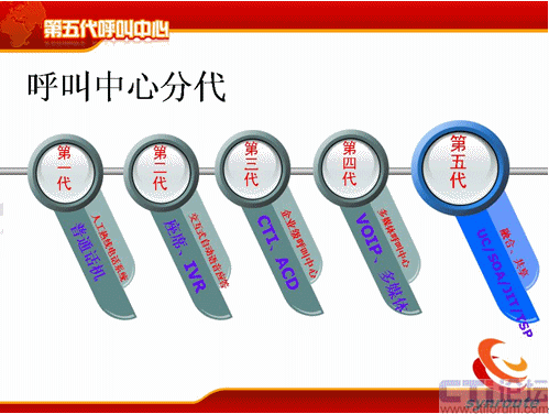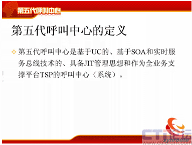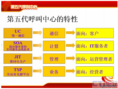第五代呼叫中心的定義比較簡單,第五代呼叫中心是基于UC的,基于SOA和實(shí)時(shí)服務(wù)總線技術(shù)的,具備JIT管理思想和作為全業(yè)務(wù)支撐平臺(tái)TSP的呼叫中心系統(tǒng)。