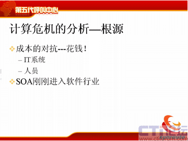 我們分析這個(gè)根源,根源其實(shí)就是錢的問題,昨天我聽了遠(yuǎn)傳的Bill的講座,講得非常精彩,而且非常幽默,他在整個(gè)講的過程中,不斷地提一個(gè)次,提了30多次,說是“很花錢”呀,“太花錢”了,“很花錢”。確實(shí)是很花錢,呼叫中心是一個(gè)燒錢的中心,這是他的理論,其實(shí)我的想法也是一樣的。那么對于IT系統(tǒng)來說,確實(shí)需要花很多錢,現(xiàn)在的系統(tǒng)大家想想系統(tǒng)要么和CRM對接,要么和ERP對接,有的和供應(yīng)鏈對接,有的和人力資源管理對接,有的和業(yè)務(wù)核心系統(tǒng)對接。那么人員上也是很花錢的,對于外包呼叫中心來說,客戶服務(wù)200座席左右的,人工的成本占到了75%,這個(gè)成本是非常高的,確實(shí)是很花錢。那么剛才也說了,剛才那些需求,短信的需求,大家看雖然很復(fù)雜,如果給我一千萬的話,我能輕松地把它搞定,給我一年的時(shí)間,但這是不現(xiàn)實(shí)的。解決的辦法有嗎?有,SOA。SOA是現(xiàn)在軟件行業(yè)一直在做的一件事情,是公認(rèn)的標(biāo)準(zhǔn),但是它剛剛進(jìn)入中國,而且還都沒有進(jìn)入呼叫中心。