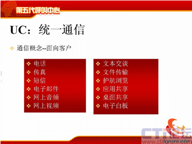 那么這幾個(gè)特點(diǎn)稍微簡單地說一下,可能大家了解比較多了,從UC上來講,不管是現(xiàn)在國際上比較領(lǐng)先的通信廠商,CISCO、華為都在提UC的概念,軟件行業(yè)包括微軟。UC包括了通信的渠道,包括電話、傳真、短信、電子郵件、網(wǎng)上音頻、視頻,文本交談,文件傳輸、護(hù)航瀏覽、應(yīng)用共享、桌面共享等等,這是統(tǒng)一通信的部分。