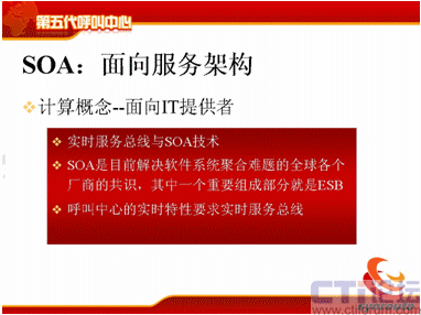 SOA就是面向服務(wù)的架構(gòu),這個(gè)概念近兩、三年來在中國的發(fā)展是比較快的,計(jì)算的概念,它是面向IT提供者。實(shí)時(shí)服務(wù)總線技術(shù)與SOA,SOA是目前解決軟件系統(tǒng)聚合難題的全球各個(gè)廠商的共識(shí),其中一個(gè)重要的概念是ESB,不知道大家清楚嗎?就是企業(yè)服務(wù)總線,是SOA里面重要的組成部分,呼叫中心的實(shí)時(shí)特性要求,這個(gè)服務(wù)總線不是普通的服務(wù)總線,而是實(shí)時(shí)的服務(wù)總線。
