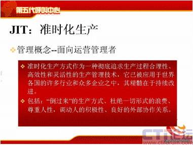 這四個(gè)特性是相輔相成的,首先在獨(dú)立方面,每一部分都有自己的特點(diǎn),適應(yīng)自己企業(yè)發(fā)展的需要,同時(shí)也是相互制約的。首先我說這個(gè)獨(dú)立意識(shí),對于呼叫中心來說,從經(jīng)營者的角度上,為什么要提TSP的概念呢?我們經(jīng)常遇到一個(gè)企業(yè)建立呼叫中心,是一個(gè)客戶服務(wù)中心,我們現(xiàn)在要做電話營銷了,那好吧,我們就建一套電話營銷系統(tǒng);這時(shí)候我們要做網(wǎng)絡(luò)方面的營銷,好了,我們再做一個(gè)網(wǎng)絡(luò)營銷的呼叫中心,這是經(jīng)營者現(xiàn)在意識(shí)亟待需要提高的。對于運(yùn)營管理者來說,JIT思想,我剛才說過它是一個(gè)核心的,它是一個(gè)不斷需要改進(jìn)流程的,改進(jìn)去優(yōu)化的,提出各種KPI指標(biāo)去優(yōu)化的,那么這個(gè)過程也是現(xiàn)在目前運(yùn)營管理者一直比較薄弱的,需要一直提高的部分。