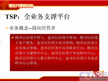 TSP這個(gè)概念其實(shí)比較清晰,比較簡單,它的意思就說對于呼叫中心來說,它能支持各種業(yè)務(wù),既可以支持呼入,也可以支持呼出;既可以應(yīng)用于客戶服務(wù),也可以應(yīng)用于電話營銷;既可以應(yīng)用于商業(yè)領(lǐng)域,也可以應(yīng)用于政務(wù)領(lǐng)域;既可以用于自建,也可以用于外包;可以是大規(guī)模集中的,也可以是分布式的。