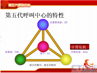 從分代上來講,和何總說的稍微有點(diǎn)差異,但是基本上一樣的,第一代是人工熱線的電話系統(tǒng),時(shí)間點(diǎn)也差不多;第二代是有了座席IVR、自動(dòng)語音應(yīng)答這個(gè)特點(diǎn);第三代是有了CTI、ACD企業(yè)級的呼叫中心;第四代是互聯(lián)網(wǎng),有VOIP、多媒體等等這些多媒體的呼叫中心。那么第五代是什么?第五代的典型特征是融合共享,它是有四個(gè)特性,UC、SOA、JIT和TSP,這是五代的幾個(gè)主要特點(diǎn)。
