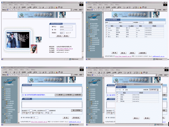 企業(yè)里的每個用戶要實現(xiàn)短信發(fā)送,僅需一臺電腦,然后利用瀏覽器就可以實現(xiàn)分組發(fā)送(如:會議通知、緊急通知)、定時群發(fā)(如:提醒短信、恭賀短信、祝福短信)、以及接收工作情況匯報短信等,系統(tǒng)提供通訊薄管理,可編輯常用短語。服務器端支持多個GSM設備群發(fā),滿足不同發(fā)送短信量的需要?煨┫螺d系統(tǒng)的動畫演示,新增功能多多。!