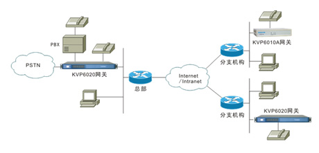 KVP6020采用模塊化設(shè)計,支持FXS、FXO、E&M、E1等多種語音模塊,最大可支持40路FXS用戶接口,可用于總部和大、中型分支機(jī)構(gòu),提供IP語音通信業(yè)務(wù),也可通過FXO、E&M、E1等中繼接口與PBX、與PSTN相連,提供中繼匯接業(yè)務(wù),典型應(yīng)用如下圖。