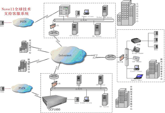 Novell中國(guó)技術(shù)支持中心采用融天科技的RT-CCP1000作為呼叫處理平臺(tái),業(yè)務(wù)處理通過(guò)Internet用瀏覽器的方式使用美國(guó)現(xiàn)有的Siebel CRM業(yè)務(wù)系統(tǒng),作為Novell全球客戶(hù)服務(wù)支撐體系的一個(gè)分支,響應(yīng)來(lái)自全球的客戶(hù)服務(wù);贗P網(wǎng)絡(luò),系統(tǒng)設(shè)立了遠(yuǎn)端座席,為不同地區(qū)的用戶(hù)提供本地化、無(wú)差異化的服務(wù)。