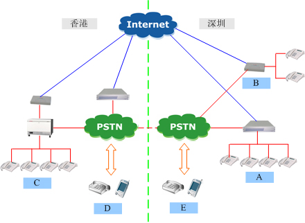 A點是深圳福田的office,B點是深圳蛇口的辦事處,C點是香港總部的office,D點香港本地電話和國際長途,E點是深圳本地的電話用戶和國際長途。