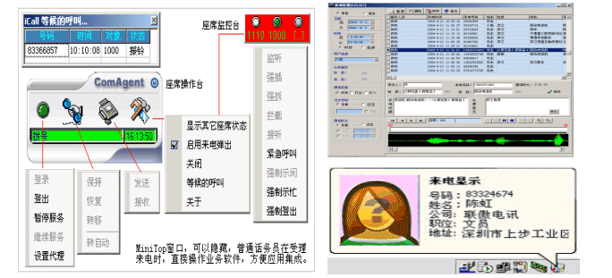 座席操作界面分類設(shè)計(jì)為Mini Top方式,可隨時(shí)隱藏或顯示;座席控件將來電號(hào)碼或在流程中收集的信息通過事件傳遞給業(yè)務(wù)系統(tǒng),話務(wù)員受理來電時(shí),直接看到的是業(yè)務(wù)處理界面。