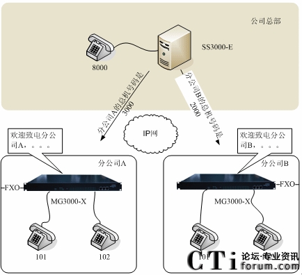 - 總部給各分公司只分配一個(gè)號(hào)碼,做為分公司的總機(jī)接入號(hào)碼,例如給分公司A分配的號(hào)碼3000。