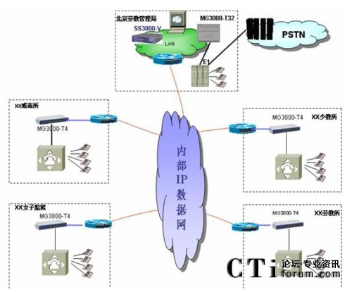 根據(jù)北京監(jiān)獄管理局情況大唐高鴻提出在監(jiān)獄系統(tǒng)現(xiàn)有的網(wǎng)絡(luò)建立IP語音系統(tǒng),使各地監(jiān)獄之間的語音服務(wù)運營在現(xiàn)有完善的IP網(wǎng)絡(luò)上,實現(xiàn)“語音、數(shù)據(jù)、視頻三網(wǎng)合一”的先進網(wǎng)絡(luò)。