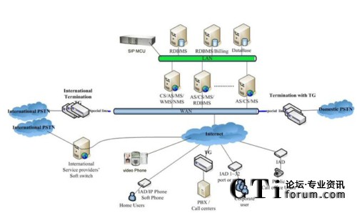 計費系統(tǒng)將把視頻通話和普通的語音通話分開來計費,視頻會議業(yè)務也可以作為一項特殊業(yè)務單獨計費。所有這些業(yè)務都使用相同的計費和OAM系統(tǒng)。在這個運營商級軟交換系統(tǒng)中,已經(jīng)把視頻業(yè)務完全集成進了系統(tǒng)。下面是網(wǎng)絡示意圖: