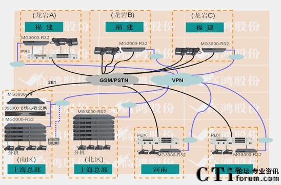 - 上海接入采用電信30B+D線路兩條。使用2E1的MG3000-T4設備接入。上海南區(qū)IP分機600門,北區(qū)IP分機300門,全部采用MG3000-R32(32FXS)設備做接入。福建龍巖A、B、C,江西高安,河南鄭州這5個分支分別采用16FXO口網關與PBX或電信虛擬網直線互聯。