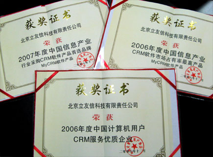 2007年1月16日,中國計算機用戶協(xié)會在京召開隆重而盛大的年度頒獎儀式。MyCRM在本次會上榮獲殊榮,一舉囊括了“2006年度中國信息產業(yè)CRM 軟件市場占有率最高產品”,“ 2006年度中國計算機用戶CRM服務優(yōu)質企業(yè)”和“2007 年度中國信息產業(yè)行業(yè)采購CRM軟件產品首選品牌”。本次獲獎充分體現了MyCRM在CRM市場的全面領先優(yōu)勢。