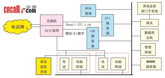華呼(www.cncall.com)典型的基于交換機平臺廣電呼叫中心解決方案的主系統(tǒng)包括:PBX交換機平臺、計算機電話集成系統(tǒng)(CTI)、交互式語音應答系統(tǒng)(IVR/IFR)、人工座席系統(tǒng)、電話錄音監(jiān)聽管理系統(tǒng)CCLog、呼叫中心管理系統(tǒng)CCM、數(shù)據(jù)庫應用系統(tǒng)、WWW服務器、應用網(wǎng)關。